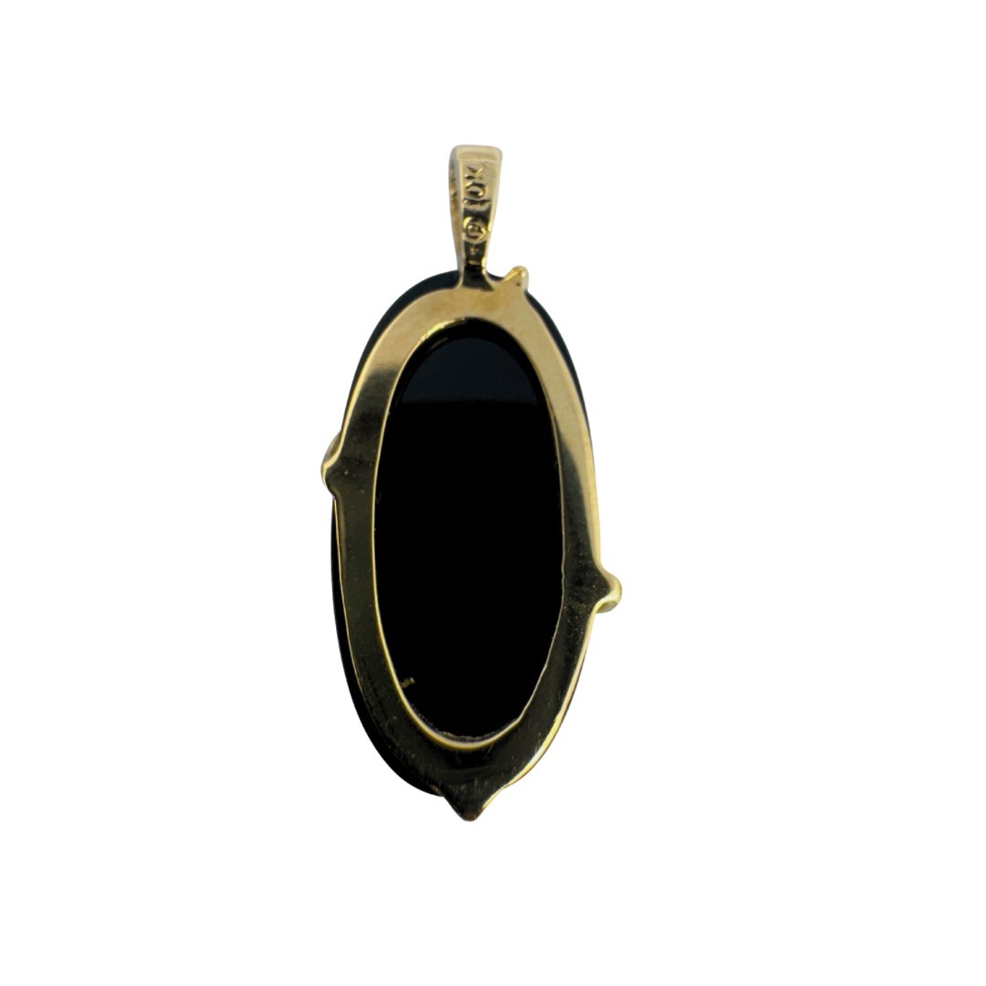 This elegant pendant showcases a sleek, polished oval black onyx as its centerpiece, framed in 10K yellow gold. A delicate openwork leaf design sweeps gracefully across the stone, accented by a single round-cut diamond for a touch of sparkle. The bold contrast of deep black onyx and warm gold creates a timeless, versatile accessory that transitions effortlessly from day to night.