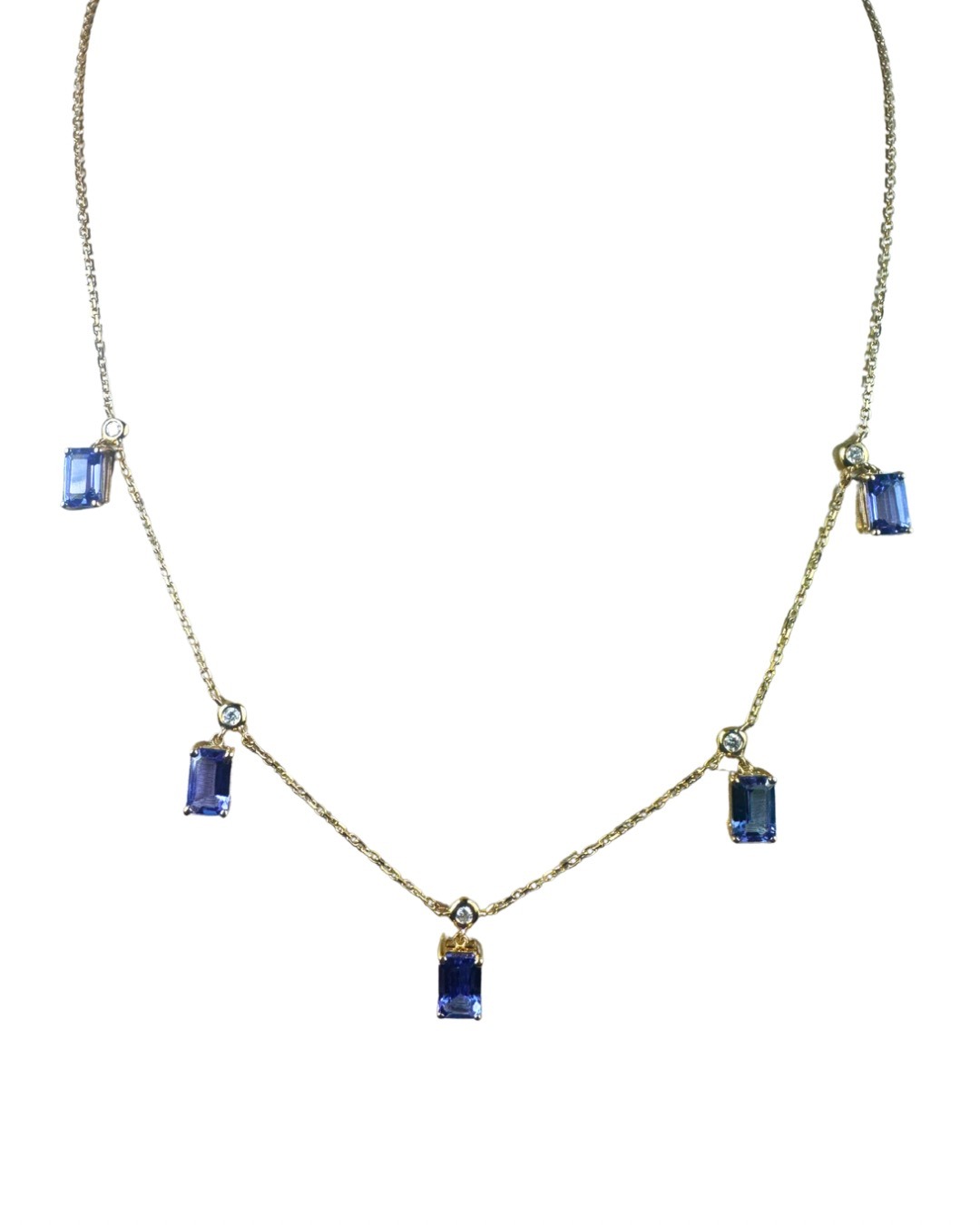 Graceful and refined, this necklace showcases five vibrant emerald-cut tanzanites totaling 2.71 carats, each suspended delicately along a 14K yellow gold chain. Above each tanzanite, brilliant round bezel-set diamonds (totaling 0.09 carats) add a touch of sparkle and sophistication.