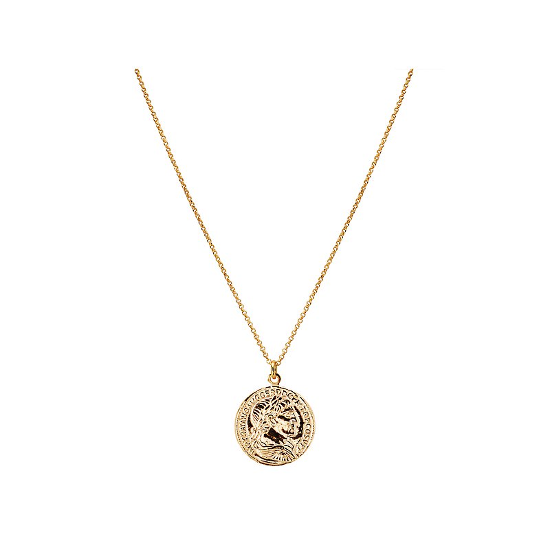 Italian rollo chain necklace has 1 micron 14kt gold plating over sterling silver with a 23.4mm coin medallion pendant. Adjusts from 16-18.