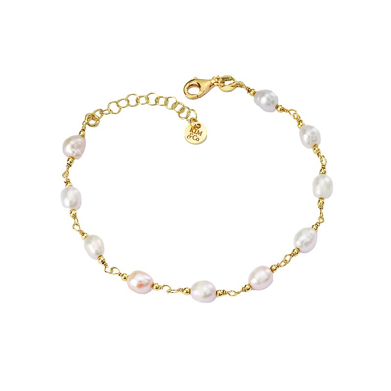 Italian chain bracelet with freshwater pearls between tiny beads. 7 inches plus 1 inch extension. Lobster clasp. Sterling silver with 1 micron of 14kt gold plating